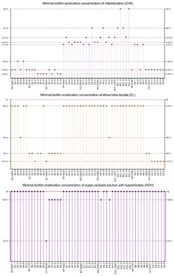 CHX eradicated the biofilm of all tested strains. The effective concentration range was 0.39–50%. The best results were observed for SE3, SE4, SE5, E. faecium ATCC 19434, EF2, EF4, EF5 (0.39%), S. aureus ATCC 6538, SA1, SA3, SA5, S. epidermidis PCM 2118, SE1, SE2, EF1, EF3, A. baumannii PCM 2740, AB3, AB5, C. albicans ATCC 10231, CA1–CA5 (0.78%), SA2 and SA4 (1.56%). Effectiveness of a high concentration of CHX was observed against ECL2, ECL5 (50%), EC4, PA2, ECL1, ECL3 (25%) and against KP1, EC2, PA1, PA4, E. cloacae ATCC 13047, ECL4 (12.5%). Intermediate results were observed for KP2, KP4, KP5. E. coli ATCC 25922, EC5, P. aeruginosa ATCC 27853, PA3 (6.25%) and for the rest of the tested strains (8 strains, 3.13%). CHX showed stronger activity against Gram-positive bacteria and yeast than against Gram-negative bacteria. The best results were observed for E. faecium, S. epidermidis and C. albicans, while the worst for E. cloacae and P. aeruginosa. EL eradicated biofilm in all cases in the concentration range 12.5–100%. The lowest active concentration was observed for SE2, E. faecium ATCC 19434 and CA1–CA5 (12.5%), while the highest concentrations were needed for S. epidermidis PCM 2118, SE1, SE3, SE4, EF1–EF5, AB5, C. albicans ATCC 10231 (25%), SA3, PA4 (50%) and for the rest of the tested strains (34 strains, 100%). The best activity of EL was observed against C. albicans, S. epidermidis and E. faecium and the worst against Gram-negative rods and S. aureus. SOH was effective against eight strains only. The effective SOH concentration for E. faecium ATCC 19434 was 50% and 100% for EF1–EF5, PA1, PA4. The biofilms formed by the rest of the tested strains (46 strains) were not eradicated by SOH, even at a working solution. The results of minimal biofilm eradication concentrations assay for CHX, EL and SOH are presented in Figure 9.
