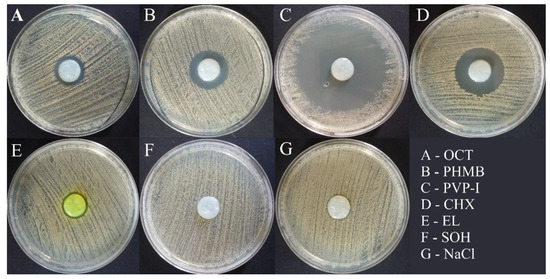 Exemplary results of the modified disc-diffusion method (applying BC as an antiseptic carrier) are shown in Figure 11.