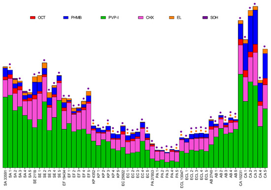 Comparison of surface areas of growth inhibition zones (mm2). SA—Staphylococcus aureus, SE—Staphylococcus epidermidis, EF—Enterococcus faecium, KP—Klebsiella pneumoniae, EC—Escherichia coli, PA—Pseudomonas aeruginosa, ECL—Enterobacter cloacae, AB—Acinetobacter baumannii, CA—Candida albicans. Tested substances: OCT—octenidine dihydrochloride, PHMB—polyhexanide, PVP-I—povidone-iodine, CHX—chlorhexidine, EL—ethacridine lactate, SOH—super-oxidized hypochlorites solution. Bar size represents the average surface area (mm2) of growth inhibition zones. Dots indicate ineffective compounds, color of dot corresponds to the tested compounds.
