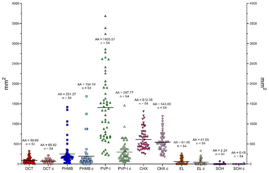 Distribution of average areas of growth inhibition zones (mm2). For every compound, there are 2 kinds of probes: chemisorbed BC dressings (OCT—octenidine dihydrochloride, PHMB—polyhexanide, PVP-I—povidone-iodine, CHX—chlorhexidine, EL—ethacridine lactate, SOH—super-oxidized hypochlorites solution) and soaked blotting paper discs compounds as a compound activity control (OCT c—control of OCT activity, PHMB c—control of PHMB activity, PVP-I c—control of PVP-I activity, CHX c—control of CHX activity, EL c—control of EL activity, SOH c—control of SOH activity). AA—arithmetic average of growth inhibition zones areas (black lines), n—number of tested strains (54).
