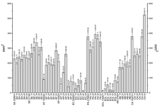 Average growth inhibition zones caused by silver dressing (mm2). The antimicrobial agent was silver dressing (Aquacel® Ag, ConvaTec, Berkshire, England). Dots indicate strains against which the silver dressing was ineffective. Tested strains: SA—Staphylococcus aureus, SE—Staphylococcus epidermidis, EF—Enterococcus faecium, KP—Klebsiella pneumoniae, EC—Escherichia coli, PA—Pseudomonas aeruginosa, ECL—Enterobacter cloacae, AB—Acinetobacter baumannii, CA—Candida albicans.