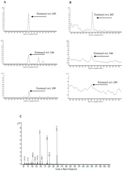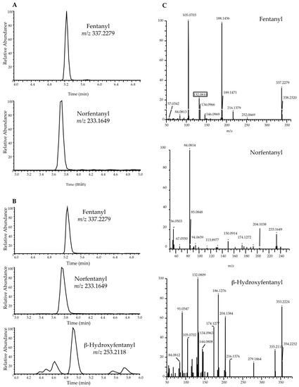 - Salomone, A.; Di Corcia, D.; Negri, P.; Kolia, M.; Amante, E.; Gerace, E.; Vincenti, M. Targeted and untargeted detection of fentanyl analogues and their metabolites in hair by means of UHPLC-QTOF-HRMS. Anal. Bioanal. Chem 2020, 413, 225–233. [Google Scholar] [CrossRef]