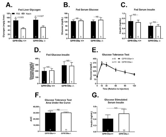 Effect of niacin on glucose homeostasis in fed GPR109a +/+ and −/− mice. Hepatic (A) glycogen (mg/g liver tissue), serum (B) glucose (mg/dL), (C) insulin (ng/mL), and (D) glucose:insulin ratio. Direct comparisons were made between injection treatment within genotype. (E) Glucose tolerance test in 4-h fasted mice. (F) Glucose tolerance test area under the curve. (G) Glucose stimulated serum insulin. Bars were analyzed by a two-sided unpaired t-test. NS = non-significant; p > 0.05; PBS = phosphate-buffered saline. Numbers inside bars denote the n per group.