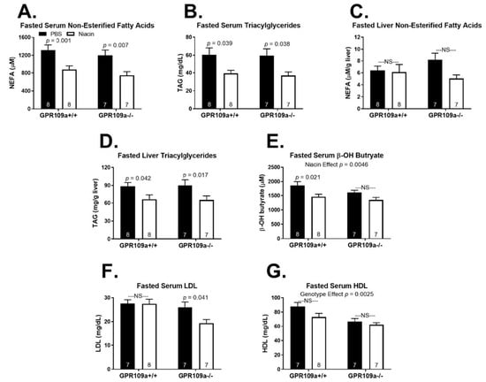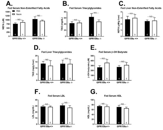 Effect of niacin on lipid and cholesterol homeostasis in 16 h fasted GPR109a +/+ and −/− mice. Serum (A) non-esterified fatty acids (NEFA; µM) and (B) triacylglycerol (TAG; mg/dL). Hepatic (C) non-esterified fatty acids (NEFA; µmol/g liver tissue) and (D) triacylglycerol (TAG; mg/g liver tissue). Serum (E) β-OH butyrate (µM), (F) low-density lipoprotein (LDL; mg/dL), and (G) high-density lipoprotein (HDL; mg/dL). Direct comparisons were made between injection treatments within genotypes. NS = non-significant; p > 0.05; PBS = phosphate-buffered saline. Numbers inside bars denote the n per group.