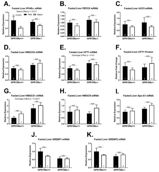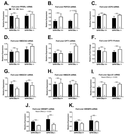 Effect of niacin on hepatic gene expression in 16 h fasted GPR109a +/+ and −/− mice. Hepatic (A) PPARα mRNA expression, (B) PEPCK mRNA expression, (C) UCP2 mRNA expression, (D) HMGCS2 mRNA expression, and (E) CPT1 mRNA expression, (F) CPT1 protein expression, (G) HMGCS1 mRNA expression, (H) HMGCR mRNA expression, (I) Apo-A1 mRNA expression, (J) SREBP1 mRNA expression, and (K) SREBP2 mRNA expression. Direct comparisons were made between injection treatments within genotypes. NS = non-significant; p > 0.05; PBS = phosphate-buffered saline. Numbers inside bars denote the n per group.