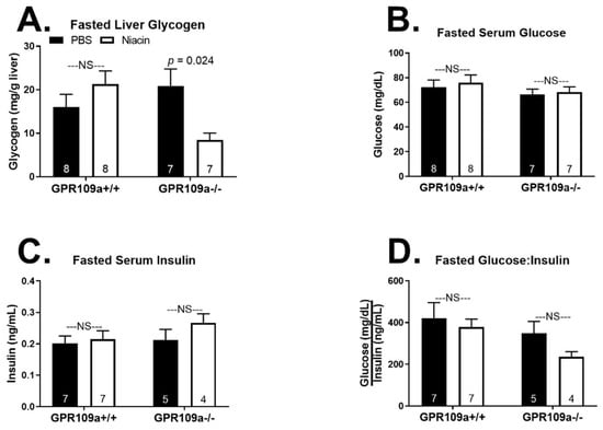 Effect of niacin on glucose homeostasis in 16 h fasted GPR109a +/+ and −/− mice. Hepatic (A) glycogen (mg/g liver tissue), serum (B) glucose (mg/dL), (C) insulin (ng/mL), and (D) glucose:insulin ratio. Direct comparisons were made between injection treatment within genotype. NS = non-significant; p > 0.05; PBS = phosphate buffered saline. Numbers inside bars denote the n per group.