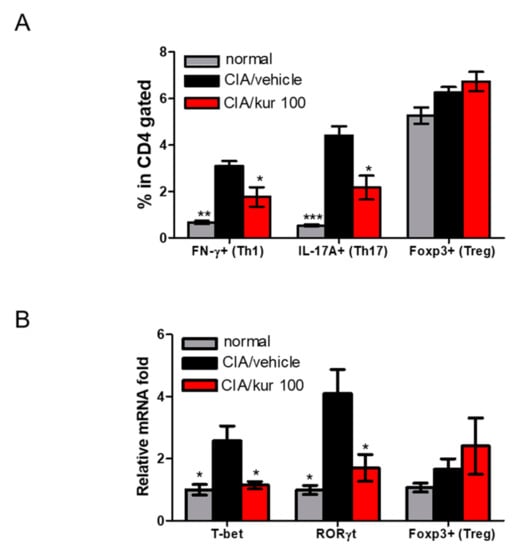 2.4. Kurarinone Altered Th1/Th17 Differentiation in Lymph Nodes of CIA Mice
