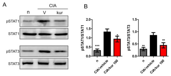 2.5. Kurarinone Suppressed STAT1 and STAT3 Phosphorylations in the LN of Kurarinone-Treated Mice