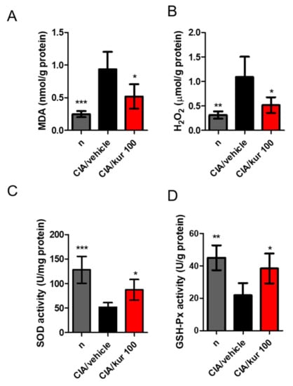 2.6. Kurarinone Suppressed Joint Oxidative Stress and Increased the Activity of Antioxidant Enzymes in CIA Mice