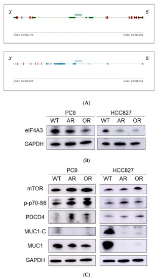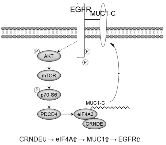 Takahashi S, Noro R, Seike M, Zeng C, Matsumoto M, Yoshikawa A, Nakamichi S, Sugano T, Hirao M, Matsuda K, et al. Long Non-Coding RNA CRNDE Is Involved in Resistance to EGFR Tyrosine Kinase Inhibitor in EGFR-Mutant Lung Cancer via eIF4A3/MUC1/EGFR Signaling. International Journal of Molecular Sciences. 2021; 22(8):4005. https://doi.org/10.3390/ijms22084005
