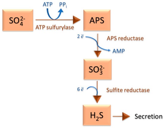 SRB can use a wide range of substances as electron donors. For example, molecular hydrogen (H2) and various organic compounds (lactate, acetate, pyruvate, malate, alcohols such as ethanol, propanol or butanol and others) can serve as electron donors in anaerobic respiration [,]. Some SRB can also use nitrates as the final electron acceptor, for example, the representatives of the genera Desulfovibrio or Desulfobacterium [,,,]. Organic substrates can be oxidized by various species either incompletely to acetate (e.g., by the genus Desulfovibrio) or ultimately to carbon dioxide (e.g., by the genus Desulfomicrobium) []. The process is referred to as dissimilatory sulfate reduction or sulfate respiration. In this process, a small amount of reduced sulfur is assimilated, but most of it is released into the environment in the form of a sulfide ion, but usually as hydrogen sulfide (Figure 1). No other microorganisms than SRB are known to be capable of this form of respiration [].