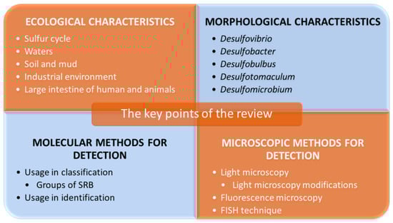 Intensive SRB studies started in 1895 when M. W. Beijerinck discovered an interesting biological activity in a newly isolated species, “Spirillum desulfuricans” (later Desulfovibrio desulfuricans). Indeed, it was the dissimilatory sulfate reduction activity that he discovered. Many other scientists went on to study SRB and new cultivation techniques of anaerobes, and the development of molecular techniques led to the characterization of many new taxa []. Recent studies are aiming to reveal the possible usage of SRB in biotechnology, too, where SRB can be used, for example, for bioremediation of toxic compounds in the environment [,,,]. Other studies investigate SRB’s capability to cause microbial corrosion and oil acidification, which is causing considerable economic losses. It is worth mentioning that SRB inhabit very diverse habitats. These organisms have successfully adapted to almost any ecosystem on Earth, from waters to soils and animal guts, humans included. SRB were detected in both the human intestines and oral cavity of patients with periodontitis []. Therefore, another important field of study considering SRB is their potential role in inflammatory bowel diseases or periodontitis, as SRB produce hydrogen sulfide, which is toxic to cells [,,,,,]. The detail information regarding the metabolism of SRB, their role in natural processes, or their industrial impacts can be found in the works of R. Rabus, T.A Hansen and F. Widdel [], J. M. Odom [] or F. Widdel and F. Bak []. Considering the wide range of habitats in which SRB can be found, including their possible impact on human health and economics, it is crucial to study these microorganisms further. The main points that should be investigated are the habitats of this group of organisms, their ecological interactions and finally, the development of a broad range of efficient methods to reliably detect and identify them in the context of both research and clinical usage. The main points that will be a part of this review are shown in Figure 2.