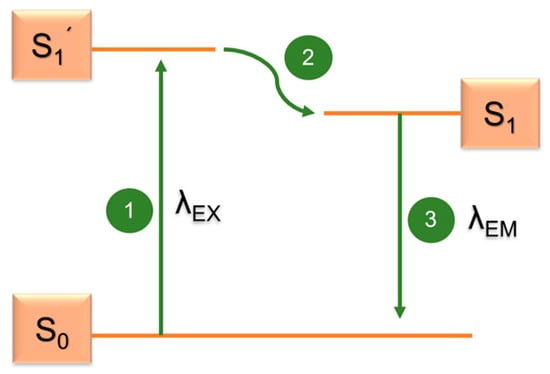 The method is based on the phenomenon of fluorescence–after irradiation with light of a certain wavelength λEX, some substances absorb the energy of this radiation (excitation) and soon after, they emit light of another wavelength (λEM) again (emission). There are three phases taking place from a physical point of view, described by the Jablonski diagram (Figure 4) [].