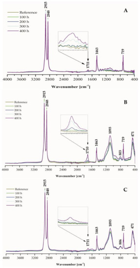 Fourier—transform infrared spectra of: (A) pure Topas, (B) Topas with silica, (C) Topas with silica and hesperidin, before and after 100, 200, 300 and 400 h of weathering.