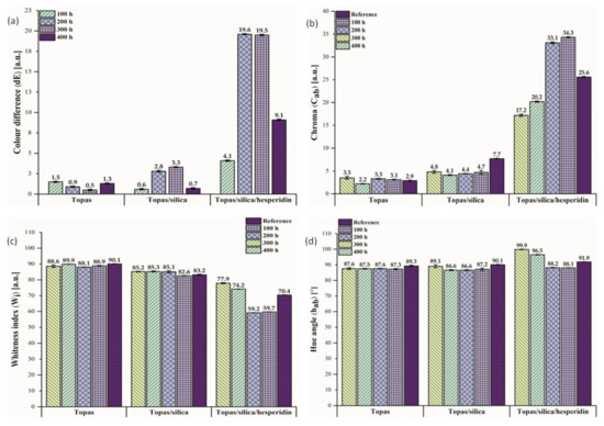 The next step in this study was an evaluation of colour difference measurement for Topas-based composites performed by UV-Vis spectrophotometry. Colour changes are often the first visible sign of polymeric materials’ degradation and especially in optical appliances in which a transparency of the material is required, this is not an acceptable outcome. In some cases, however, a colour change can be recognized as an asset. Firstly, colourful additives applied in polymer products, can act as natural dyes because the addition of flavonoids to polymers can match the colour changes of the final polymeric products. Rangel de Sousa et al. (2016) [42] investigated the anti-UV aging action of beetroot and annatto extracts in an ultra-high molecular weight (UHMWPE) matrix. According to the authors, both the beetroot and annatto seed extracts can act efficiently as pigments for the same polymeric matrix. Moreover, more and more scientific papers describe a possibility of using natural antioxidants as successful stabilizers in active food packaging, in which they are able to slow down or prevent the oxidation processes of food components, such as lipids and proteins [43,44,45,46]. Masek et al. [28] applied pure quercetin as an eco-friendly color indicator in a Topas copolymer and their research showed that this compound changed the color of the materials under the influence of various factors, such as UV radiation, temperature, and humidity. Therefore, it can be used as a colour indicator of aging time of the polymeric products. This paper is focused on hesperidin as a potential dye and colour indicator in polymers. Table 2 shows the colour parameters (L*, a*, b*) of the Topas-based vulcanizates before aging that represent the differences between points plotted in the CIE-Lab space, which are related to the visual colour changes. Figure 4 presents the obtained results of colour difference (A), chroma (B), whiteness index (C), and hue angle (D) values for tested samples after 100, 200, 300 and 400 h of weathering aging including daytime and nighttime cycles.