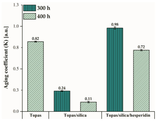 Aging coefficient values for pure Topas after 400 h of weathering and for Topas blends with silica and silica with hesperidin after 300 and 400 h of aging, respectively.