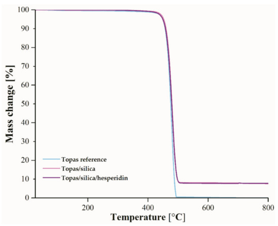TGA curves of pure Topas and filled with silica and silica with hesperidin before aging that were heated from 25 to 800 °C.
