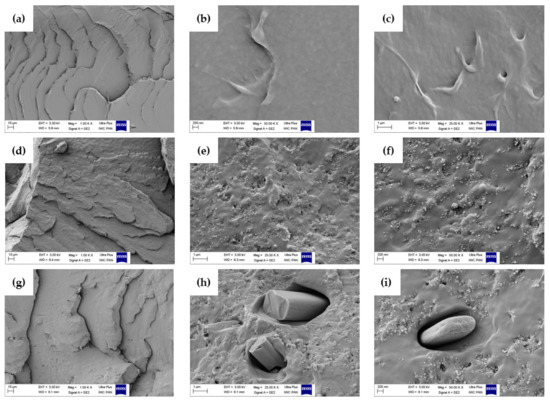 Morphology of (a–c) pure Topas, (d–f) Topas-silica, (g–i) Topas-silica-hesperidin composites obtained by the scanning electron microscopy (SEM) with 1000×, 25,000× and 50,000× magnification.