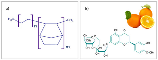 Structural formulas of: (a) polymer matrix—ethylene-norbornene copolymer (Topas), (b) natural flavonoid—hesperidin with antioxidant properties.