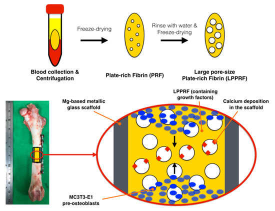 The objective of the present study was to create a construct by using PRF with MC3T3-E1 preosteoblasts, combined with a biodegradable Mg ring, to mimic the cell migration and calcium extracellular matrix generation that occurs during bone repair. Regarding the PRF collected from rabbits, their pore space volume was first increased using the repeated freeze drying method and MC3T3-E1 cells were cultured in the PRF. The large pores of PRF offered MC3T3-E1 cells adequate space for migration and the platelets that were part of the PRF scaffold provided growth factors for osteoinduction. Moreover, the Mg ions released from the Mg ring facilitated osteoinduction. The construct has great potential as a scaffold for bone defect repair due to the engineered osteogenetic environment. The PRF was randomly assigned to the following groups: PRF + Mg, PRF + Ti, LPPRF + Mg and LPPRF + Ti. The minimum sample number was N = 5 per group.