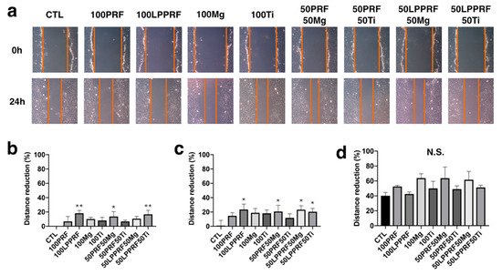 Migration capacity of MC3T3-E1 preosteoblasts cultured with platelet-rich fibrin, large-pore platelet-rich fibrin, magnesium ring and titanium ring precipitate media and their mixtures. (a) Cell migration at first scratch and after 24 h of incubation; reduction of the gap due to migration of MC3T3-E1 preosteoblasts after (b) 4, (c) 8 and (d) 24 h of incubation. (N = 5 per group; * p < 0.05 and ** p < 0.01).
