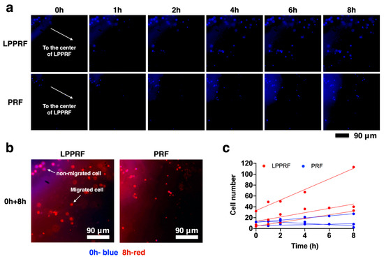 According to our hypothesis, LPPRF can achieve greater cell migration than can PRF, which has smaller pores than LPPRF. Figure 8a indicates that the MC3T3-E1 preosteoblasts that were cultured, attached and migrated in the fibrin structure of LPPRF and PRF sheets at 1, 2, 4, 6 and 8 h. Images were captured continually at the same position using a fluorescence microscope. After 24 h of incubation, the cells had migrated in the scaffold and were visible in the images. Both the LPPRF and PRF sheets exhibited cell migration from the sheet edge to the center. To clearly identify the differences in cell locations between 0 and 8 h of incubation, the color of the 8 h images was changed to red by using Image J software and the images captured at the two time points were overlaid (Figure 8b). In Figure 8b, the blue labels represent the cells that first attached in the LPPRF and PRF sheets and the red labels represent the cells that migrated after 8 h. The cells attached from the beginning were not observed to have migrated to other positions. However, many cells migrated to another position within the view that we captured. At each time point, the cell number was counted to establish cell migration ability in LPPRF and PRF. Figure 8c presents a plot of cell number against time and the assistance trend line clearly indicates the extent of cell migration. LPPRF yielded superior cell migration ability for MC3T3-E1 preosteoblasts relative to PRF.