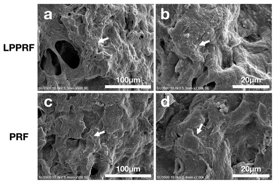 Scanning electron microscopy images of MC3T3-E1 preosteoblasts cultured on (a,b) large-pore platelet-rich fibrin and (c,d) platelet-rich fibrin captured with different magnification.