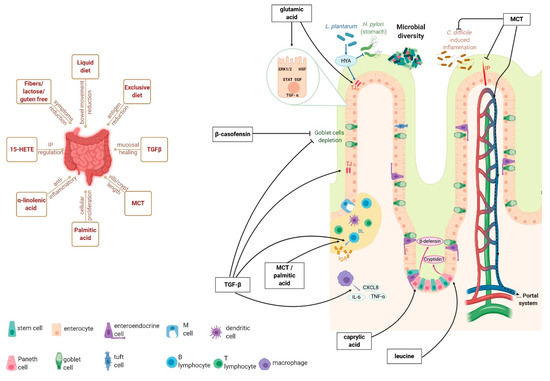 Some studies in the scientific literature discuss fatty acids’ benefits to the intestinal mucosa. For instance, a palmitic acid-enriched diet has promoted B lymphocyte proliferation, IgA production, and cellular proliferation after a 75% bowel resection (Figure 1, right panel) [51]. Even if the whole fatty acids content of Modulen® is not specified, some of them spotlighted may contribute to clinical remission (Figure 1, right panel) [32]. Among them, medium-chain triglycerides (MCT), which include caproic, caprylic, capric, and lauric acid esterified, are digested and absorbed easier than long-chain triglycerides. In comparison, MCT are shorter carbon chain, more hydrophilic, and then does not require bile acids or cholecystokinin. Their absorption is passive and permits to gain portal system without chylomicron formation (Figure 1, right panel). MCT have shown their capacity to enhance intestinal mass and cellular proliferation at the proximal level [52], as well as villi length, crypts depth, and IgA production [53]. Additionally, studies have demonstrated that MCT can attenuate Clostridium difficile-induced inflammation [54]. More specific outcomes have been presented in in vitro studies with IPEC-J2 cells, in which caprylic acid enhanced the β-defensin 1/2 secretion [55] and capric acid attenuates the oxidation, IP, and cyclophosphamide-induced inflammation (Figure 1, right panel) [56].