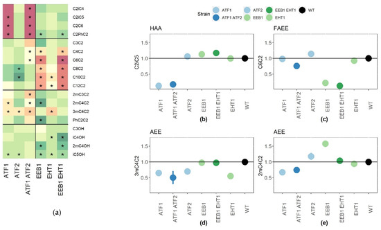Depletion effect of the activities of acetyl-transferase (Atf1p/Atf2p) and acyl-CoA:ethanol-O-acyl transferase (Eeb1p/Eht1p) on linear esters. (a) Modalities significantly different from the wt are shown for all the volatile compounds measured. The symbol * indicates which modality is significantly different from the wt according to a Kruskal–Wallis test followed by a post-hoc Fisher’s LSD analysis (α = 0.01). (b–e) Gene deletion effects for representative compounds of each ester class family, C2iC5 (isoamyl acetate), C6C2 (ethyl hexanoate), 3mC4C2 (ethyl 3methyl butanoate), and 2mC4C2 (ethyl 2methyl butanoate), respectively. The raw values of each deletion strain were normalized by the average value of the control strain Fx10. Each point and bar represents the mean and the standard error computed from 3 to 6 independent biological repetitions.