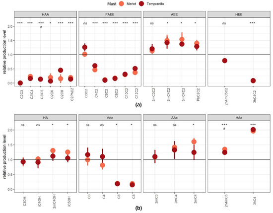 Relative production of esters and their metabolic precursors in a nearly “esterase free” strain. Raw values of the strain Fx10-ΔAE were normalized by the average value of the control strain Fx10. (a) The panel shows the relative production of each compound of the four ester families in both grape musts (Merlot and Tempranillo). (b) The panel shows the relative production of each metabolic precursor compound of each family in two grape musts. Each point and bar represents the mean and the standard error computed from 3 independent biological repetitions for each grape must. The symbols * and *** indicate which compounds have a significantly different production level with respect to the wt (post hoc HSD test based on the ANOVA, α = 0.05 and 0.001, respectively). The symbol # indicates which compounds have a significantly different production level according to the grape must origin (post hoc HSD test based on the ANOVA α = 0.05).