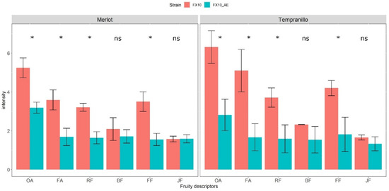 Sensory analysis of fruity perception of nearly “ester free” wines. Wines fermented by the yeast strains Fx10 and Fx10-ΔAE were evaluated by sensorial analysis by 26 panelists who evaluated the intensity of different fruity descriptors: OA: overall aroma, FA: fermentative aroma, RF: red fruit, BF: black fruit, FF: fresh fruit, JF: jammy fruit. The average intensity value for each descriptor and each strain is represented for the Merlot and Tempranillo wines. A Wilcoxon test was carried out to identify the difference of intensity between the two strains; the symbol * indicates a significant difference (α = 0.05).