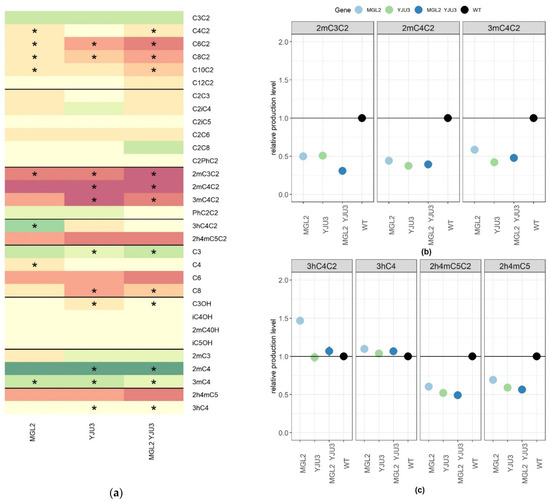 In the previous sections we clarified the role of AATses and AEATases in the biosynthesis of linear esters and 3hC4C2. However, AEE and ethyl leucate biosynthesis have not yet been completely elucidated. As well as Atf1p, Atf2p, Eeb1p, and Eht1p, other enzymes may play a role in substituted ester biosynthesis. We hypothesized that the two proteins Mgl2p and Yju3p may modulate the concentration of fatty acids, which are the precursors of ethyl esters. Indeed, these proteins have been characterized for their mono-acyl glycerol lipase (MAGLase) activity [26,27]. To test this hypothesis, the same functional genetic strategy was applied and both enzymes were inactivated in the strains Fx10-ΔM (Δmgl2) and Fx10-ΔY (Δyju3). Their combined effect was also evaluated in the double mutant Fx10-ΔYM (Δyju3, Δmgl2) (Table 2). Again, the fermentation kinetics of such strains was similar to the control (data not shown). The depletion effect of MAGLase activity is summarized in a heat map (Figure 4a). Mgl2p and Yju3p played a very moderate role in the biosynthesis of linear esters of fatty acids and did not influence the production level of higher alcohols and their corresponding acetate esters (Figure S2a,b). Although significant, the inactivation of MAGLases had only a slight effect on FAEE production (−10%) (Figure S2c,d) compared to AEATse inactivation (Figure 1 and Figure 2). In contrast, MAGLases were significantly involved in the de novo synthesis of most substituted ethyl esters. Indeed, AEE production was reduced by nearly 50% compared to the control in single and double mutants (Kruskal–Wallis test α = 0.01) (Figure 4b). However, the double deletion of MGL2 and YJU3 did not abolish AEE production, suggesting that other enzymes (including Eeb1p and Eth1p) compensated for their inactivation. Remarkably, Mgl2p and Yju3p did not affect the production level of a phenyl-substituted ester (PhC2C2), which seemed to have been produced by another enzyme (Figure 4a). The biosynthesis of hydroxylated esters showed a more contrasted genetic determinism. Ethyl-leucate (2h4mC5C2) was reduced by nearly 50% in the double mutant (Figure 4c) but, as observed for alkylated esters, its production was not fully abolished. This drop was positively coupled with the biosynthesis of its corresponding acid (2h4mC5) (Figure 4c). This suggests that MAGL may control the biosynthesis of the ethyl 2-hydroxy-4-methylpentanoic acid, which in turn influences the production level of ethyl-leucate. In contrast, the production level of ethyl-3 hydroxy-butanoate (3hC4C2) was not evenly impacted by MAGL inactivation. MGL2 deletion promoted 3hC4C2 synthesis (+50%), whereas YJU3 deletion had no impact with a dominant effect on MGL2 (Figure 4c). Altogether, these findings demonstrate for the first time the impact of MAGLase activity on the biosynthesis of volatile substituted esters in the context of alcoholic fermentation.