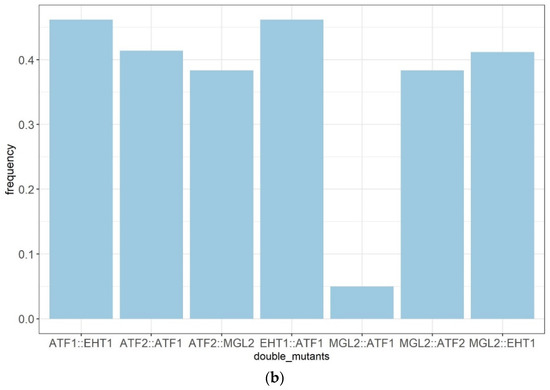The possible metabolic connection between enzymatic activities (AATase, AEATase, and MAGLase) prompted us to integrate the MGL2::KanMx allele into the Fx10-ΔAE strain, which significantly impacts AEE and HEE biosynthesis. Using a breeding strategy, an F1 hybrid (Fx10-ΔAEM) was obtained by crossing the appropriate haploid segregants of Fx10-ΔAE and Fx10-ΔM. Since deleted genes are located in different chromosomes, the expected frequency of an Fx10-ΔAEM progeny with the quintuple-deleted genes would be 1/32. Surprisingly, by genotyping such progeny by PCR, we failed to identify any segregant harboring all five deleted genes in the 296 spores dissected (Figure 5a). In order to increase the chance of obtaining this progeny, different combinations of Fx10-ΔAEM segregants were crossed with each with the aim of fixing some desired alleles. For some haplotype combinations, the isolated F2-zygotes did not develop a central bud and stopped their growth at the first division stage. This prezygotic incompatibility was visually observed in three haplotype combinations (H1xH2, H1xH3, and H3xH6) in 70 distinct zygotes (Table 3). In contrast, other crosses (H1xH5 and H1xH6) developed zygotes with a perfect fitness. The sporulation of these viable F2-hybrids (H1xH5 and H1xH6) would also allow the isolation of segregants carrying the five deleted genes with a frequency of 1/8. Among the 176 progenies dissected, we failed to obtain a strain deleted for the five genes (Δatf1, Δatf2, Δeeb1, Δeht1, Δmgl2). In these two F2-hybrids, seven pairs of double mutants were expected with a frequency of 50% (Figure 5b). Surprisingly, the double mutant (Δatf1, Δmgl2) was barely represented (5%) compared to other combination pairs (chi-square test p = 1·10−7), indicating a probable deleterious interaction. However, this interaction cannot be considered a synthetic lethality since some (Δatf1, Δmgl2) strains were isolated in the Fx10-ΔAEM progeny (haplotypes H2 and H3). Another noteworthy result is the low germination percentage of the hybrids dissected (between 82 and 75%), which is quite unusual in nearly isogenic crosses. By typing all the progenies dissected, we inferred the genotype of non-viable clones. Most of them appeared to have the “five deleted genes” pattern sought (data not shown). These findings strongly suggest that the combined loss of MGL2 and ATF1 genes confers a drastic and unexplained loss of viability.
