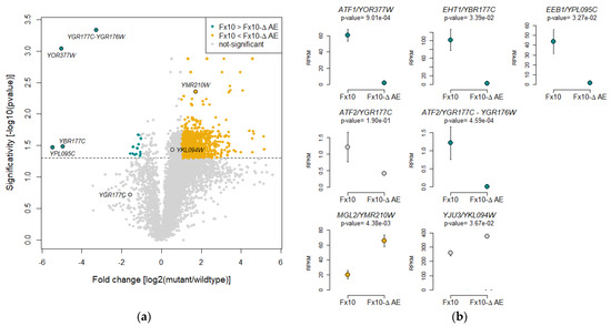 RNA-seq analysis of the Fx10-ΔAE mutant. (a) Volcano plot showing differentially expressed genes in the Fx10-ΔAE mutant compared to the Fx10 wildtype strain. A total of 6287 genes were considered, of which 1124 were DEGs. Yellow and blue-green dots show the 22 and 1102 genes downregulated or upregulated in the mutant, respectively. Gray dots represent the 5163 non-significant genes. (b) Expression patterns for genes of interest in the Fx10 wildtype and the Fx10-ΔAE mutant. RPKM stands for reads per kilobase million. Error bars represent standard errors. p-Values were corrected for False Discovery Rate (FDR) multiple tests.