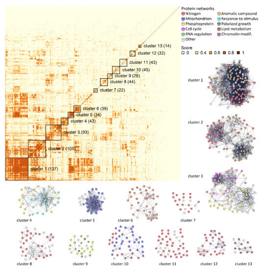 A gene ontology (GO) analysis identified 23 GO categories that were significantly enriched or depleted in DEGs (hypergeometric distribution with Holm–Bonferroni correction, α = 0.05). Interestingly, most of the GO categories concerned major biological processes involved in cellular housekeeping functions, including mRNA and rRNA processing (GO:0006397, GO:0006364), cell division (GO:0051301), transmembrane transport (GO:0055085), and oxidoreduction process (GO:0055114). The strong enrichment in genes related to RNA metabolism was also confirmed by a significative enrichment in RNA binding function (GO: 0003723), as well by the fact that half (517) of the 1124 genes were associated with the nucleus (GO:0005634), i.e., three times more than the proportion expected for the whole genome (Figure S3). This first analysis revealed that the deletion of the main esterase genes triggered an unexpected modification of genome expression in the strain Fx10-ΔAE. In order to unravel this surprising expression repatterning, we sought functional connections between DEGs by searching in the protein–protein interactions (PPI) database (string-db.org). A cluster analysis of the PPI score matrix allowed the identification of 13 PPI clusters sharing functional relationships (Figure 7). Each cluster encompassed more than 14 proteins and reached an average score higher than 0.51. Most of them (clusters 1, 2, 6, 7, 8, 10, 11, and 12) were enriched in protein networks related to nitrogen and lipid metabolism (GO:0006807, GO:1901564, GO:1901566, GO:0006629). This connection with metabolism was not directly identified by the GO enrichment analysis, highlighting the interest of using a PPI score to discover functional components in genome-wide datasets. Interestingly, cluster 13 encompassed 14 proteins mostly involved in lipid metabolism and acyl transferase activity (GO:0016746), including the MAGLase Mgl2p. This result demonstrates that the lack of AATses and AEATase activities triggers the expression of many genes involved in the amino acid and lipid biosynthesis pathway.