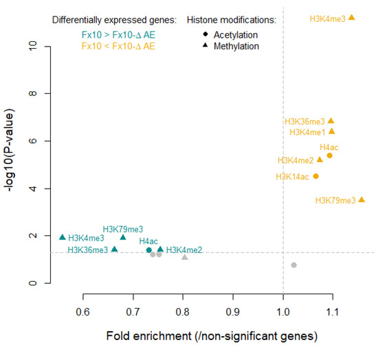 Enriched or depleted histone modifications in the Fx10-ΔAE mutant. Possible histone modifications (3 acetylations and 5 methylations) were sought for all genes. The average ratios of acetylations and methylations in up- and downregulated genes were compared to those of non-significant genes (Kruskal–Wallis tests). p-values were corrected for multiple testing with Benjamin–Hochberg adjustment. Not-significantly enriched/depleted histone modifications are shown in gray, whereas significant ones (p-value < 0.05) are colored. The histone modifications data are available from [28].