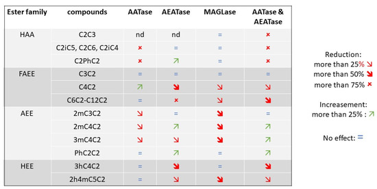 Relative contributions of AATses, AEATases, and MAGLases to the biosynthesis of volatile esters in a winemaking context.