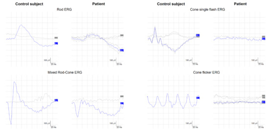 Electroretinography was performed on two occasions according to published techniques [28,29]. ERG testing showed an almost undetectable cone-mediated electroretinogram, recorded at both single flashes and 30 Hz flicker, and a reduced amplitude of the mixed rod-cone ERG with a reduced b/a wave ratio. Figure 2 depicts representative examples of rod, mixed rod-cone, and cone ERGs from the patient and a control subject. The patient’s mixed ERG showed a compromised b/a wave ratio and undetectable cone-driven (photopic) ERGs, which did not allow the evaluation of ON–OFF cone responses. The same ERG results were obtained after one year.