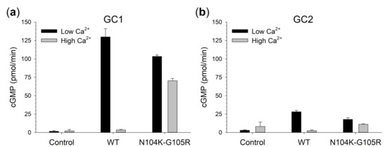 Regulation of guanylate cyclases by GCAP1 variants. Enzymatic regulation of (a) human GC1 and (b) human GC2 by 5 µM GCAP1 WT and N104K-G105R variants in activating (low Ca2+, <19 nM) and inhibiting conditions (high Ca2+, ~30 µM). Presented data are an average ± SD of 3 independent experiments.