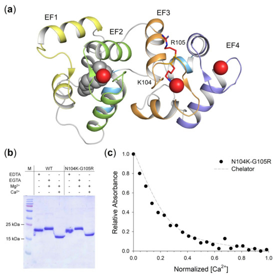 The N104K-G105R mutations affect the highly conserved residues 5 and 6 of Ca2+-binding loop of EF3 (Figure 4A; Figure S2); therefore, we assessed the effects of the loss of Ca2+-coordinating Asn carbonyl group and the substitution of a small Gly with positive, bulky Arg on the Ca2+ affinity.