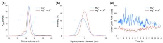 Quaternary structure and aggregation propensity of N104K-G105R monitored by analytical SEC and DLS. (a) Analytical SEC chromatograms of 42 µM N104K-G105R in the presence of 500 μM EGTA + 1 mM Mg2+ (blue) or 500 μM Ca2+ + 1 mM Mg2+ (red). (b) DLS measurements of 42 µM N104K-G105R in the presence of 500 μM EGTA + 1 mM Mg2+ (blue) or 500 μM Ca2+ + 1 mM Mg2+ (red). (c) Time evolution of the mean count rate over 15 h of 42 µM N104K-G105R in the presence of 500 μM EGTA + 1 mM Mg2+ (blue) or 500 μM Ca2+ + 1 mM Mg2+ (red). Analytical SEC and DLS experiments were carried out in 20 mM Tris-HCl pH 7.5, 150 mM KCl, 1 mM DTT buffer. Estimations of the apparent MM and the hydrodynamic diameter are reported in Table 2.