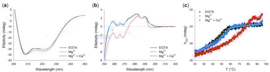 Structural and stability changes of N104K-G105R upon ion binding assessed by Circular Dichroism (CD) spectroscopy. (a) Far UV CD spectra of 10 μM N104K-G105R in the presence of 300 μM EGTA (black) and after serial additions of 1 mM Mg2+ (blue) and 600 μM Ca2+ (red). (b) Near UV CD spectra of 42 μM N104K-G105R in the presence of 500 μM EGTA (black) and after serial additions of 1 mM Mg2+ (blue) and 1 mM Ca2+ (red). (c) Thermal denaturation profiles of 10 μM N104K-G105R in the presence of 300 μM EGTA (black), 300 μM EGTA + 1 mM Mg2+ (blue) and 1 mM Mg2+ + 300 μM free Ca2+ (red). CD spectroscopy measurements were conducted in 20 mM Tris-HCl pH 7.5, 150 mM KCl, 1 mM DTT buffer. Thermal denaturation profiles were collected by monitoring the ellipticity at 222 nm between 20 and 96 °C and were fitted to a function accounting for thermodynamic contributions described in the Methods section.