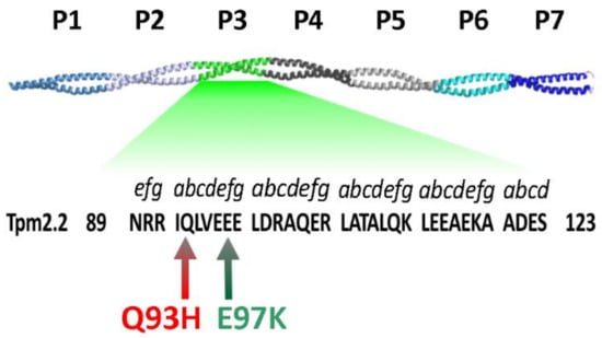 Localization of substitutions Q93H and E97E in the sequence of actin-binding period 3 of Tpm2.2. The coiled coil structure of tropomyosin is illustrated by the 7 Å crystal structure of Tpm1.1 (PDB: 1C1G). Actin-binding periods P1–P7 are marked with different shades of blue and grey, except for P3, which is marked with green. The arrows point to the positions of the substitutions in the sequence (amino acids 89–123) of human Tpm2.2 (NCBI: NP_003280.2). Positions of the amino acids in the heptapeptide repeat (a–g) are shown above the amino acid sequence.