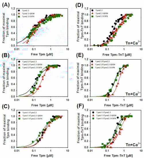 Given the localization of the substitutions Q93H and E97K—either in close vicinity or within the actin-binding site [,,]—changes in the affinity of mutant Tpm2.2 were expected to be one of the most prominent effects of the mutations. For this reason, affinities of wild type and mutant Tpm2.2 in the three dimer forms were examined (Figure 3).