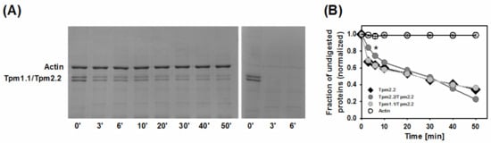 First, we checked if the digestion rate of wild type homodimer Tpm2.2 differed from the digestion rate of the crosslinked wild type homo- and heterodimers. As observed previously [], free tropomyosin was completely digested within 3 min, but dimers were partially protected by F-actin (Figure 4A). Crosslinking the chains of Tpm2.2 slowed down the initial rate of proteolysis, but crosslinked Tpm1.1/Tpm2.2 heterodimer was digested at a rate indistinguishable from the noncrosslinked homodimer (Figure 4B).