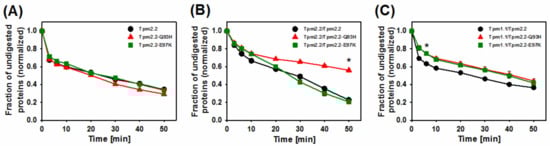 Further analyses demonstrated that the mutations had no effects on the digestion rate of homodimers with mutation in both chains (Figure 5A). When the mutations were present in only one chain of Tpm2.2, digestion was strongly decreased by Q93H, but not by E97K (Figure 5B). However, in the Tpm1.1/Tpm2.2 heterodimer, both mutations significantly (p ≤ 0.05) decreased tropomyosin susceptibility to proteolysis with trypsin (Figure 5C).