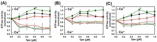 Ca2+-sensitivity of the actomyosin ATPase activity was measured at Ca2+ concentrations increasing from 1 × 10−10 to 1 × 10−3 M. The proteins were used at the following concentrations: 5 µM actin, 1 µM myosin S1, 0.6 µM tropomyosin, and 1.0 µM troponin. The experimental points were normalized according to the equation: