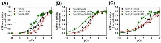 Sensitivity of the actin filaments to increasing [Ca2+]. Actomyosin ATPase activity in the presence of Tpm2.2 homodimers (A), crosslinked Tpm2.2/Tpm2.2 heterodimers (B), and crosslinked Tpm1.1/2.2 heterodimers (C). The symbols are: actomyosin S1 ATPase regulation by Tpm2.2 (black circles), Tpm2.2-Q93H (red triangles), and Tpm2.2-E97K (green squares) in complex with troponin. The lines were generated by fitting the experimental points to the Hill equation (Equation (3)). Protein concentrations: 5 μM F-actin, 1 μM myosin S1, 0.6 μM tropomyosin, and 1.0 μM Tn. Other conditions as in Figure 6 legend.