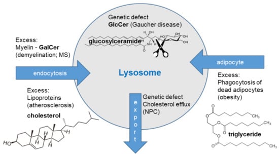 First, the conditions characterized by flaws in the catabolic machinery are explained, exemplified by lysosomal storage disorders (LSD), Gaucher Disease (GD), and Niemann-Pick type C (NPC). Second, the acquired lipid overload condition, occurring, for instance, during multiple sclerosis (MS), obesity, and cardiovascular disease (CVD), are elaborated on. The ‘lysosomal’ phenotype and consequences of lipid overload in the context of macrophage-mediated inflammation are discussed.