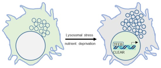 The view that lysosomes are static end-stage catabolic household organelles that degrade macromolecules, which enter the lysosomes via endocytosis, phagocytosis, pinocytosis, or autophagy, has changed drastically after two key discoveries. First, it was shown that lysosomes are under the control of transcriptional regulation, with an important role for the transcription factor EB (TFEB), which binds to the coordinated lysosomal expression and regulation (CLEAR) motif in DNA (Figure 2). Consequently, a series of genes connected to lysosome biogenesis and autophagy are transcribed and translated [,].